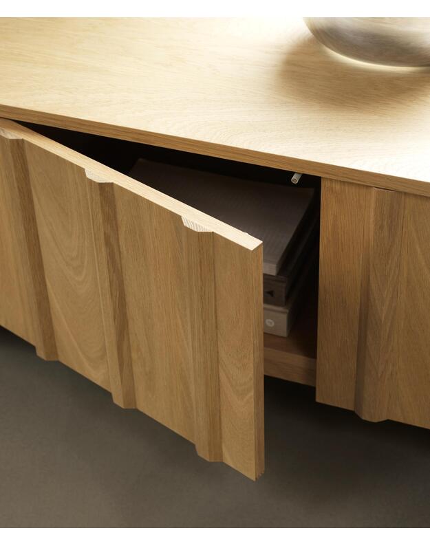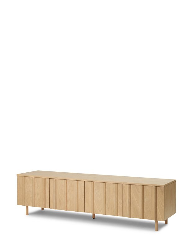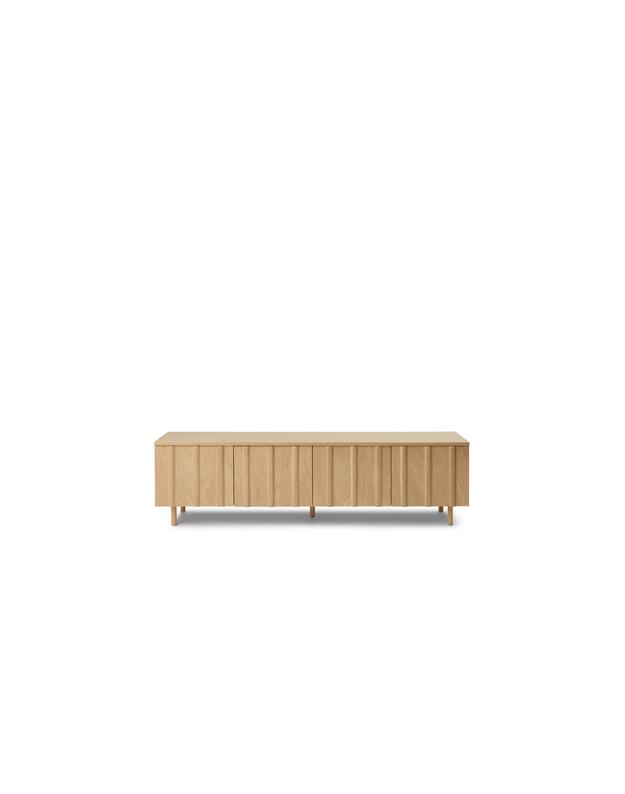 Rib is designed in lacquered oak veneer or painted and lacquered oak veneer with solid oak slats and base. Rib is equipped with a push latch, making handles redundant, and has removable shelves that can be adjusted in height, giving the possibility to store any object or belongings. Rib is delivered assembled.