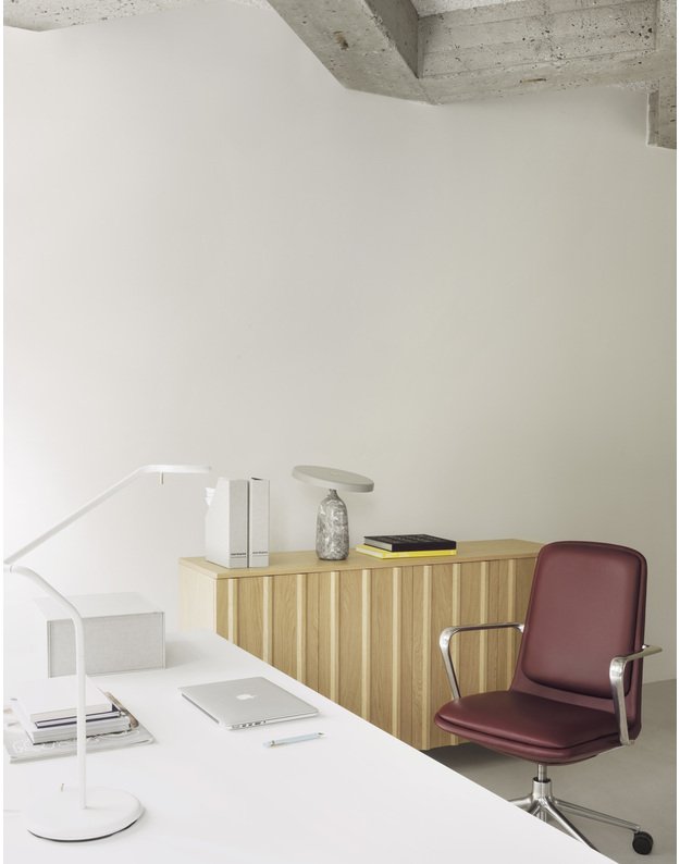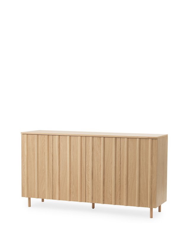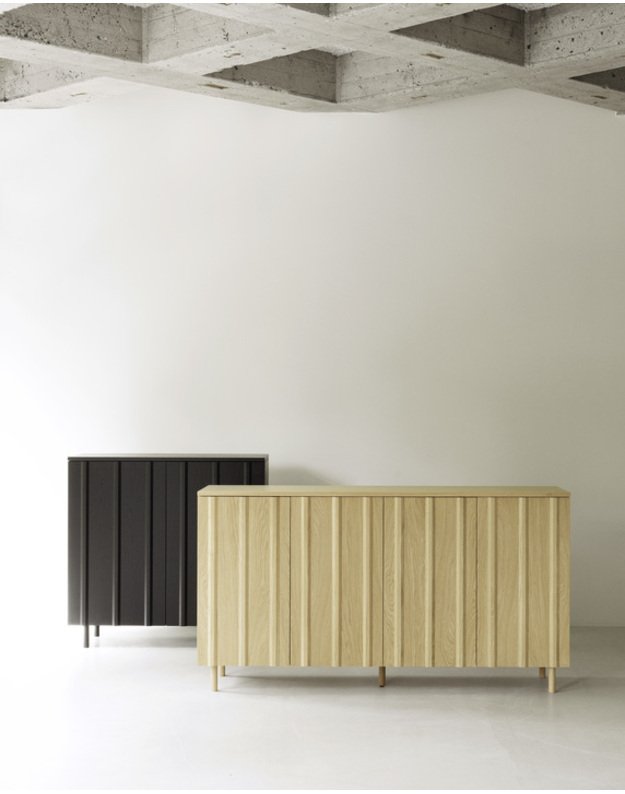 Rib is designed in lacquered oak veneer or painted and lacquered oak veneer with solid oak slats and base. Rib is equipped with a push latch, making handles redundant, and has removable shelves that can be adjusted in height, giving the possibility to store any object or belongings. Rib is delivered assembled.