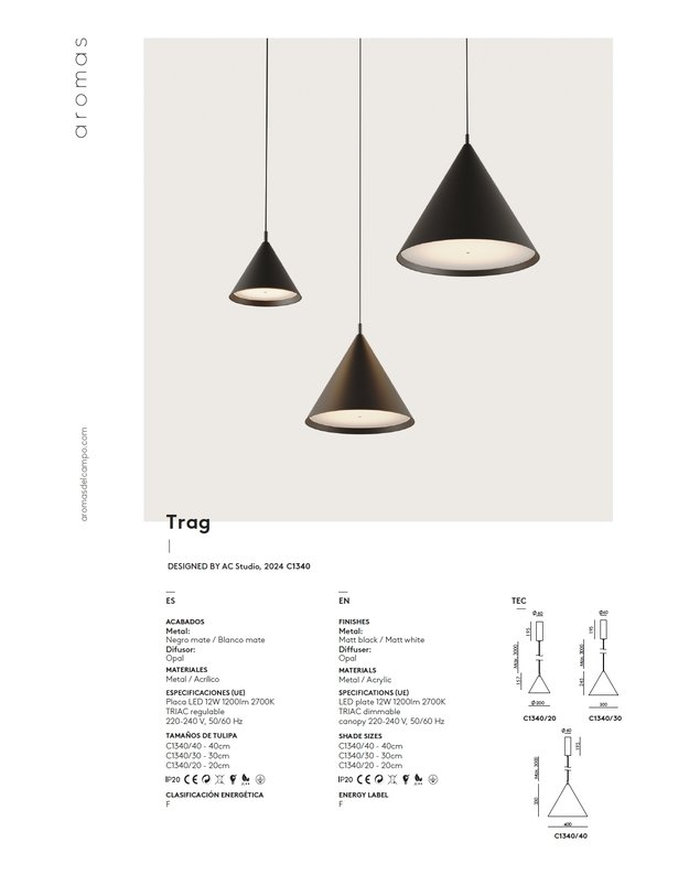 Trag šviestuvas iš Aromas del Campo kolekcijos. Aromas del Campo - 1986 metais įkurta bei tarptautinį pripažinimą pasiekusi Ispanijos šviestuvų kompanija. Aromas kolekciją sudaro architektūriškų formų šviestuvai, gaminami iš natūralių medžiagų, tokių kaip marmuras, medis, alebastras, stiklas.