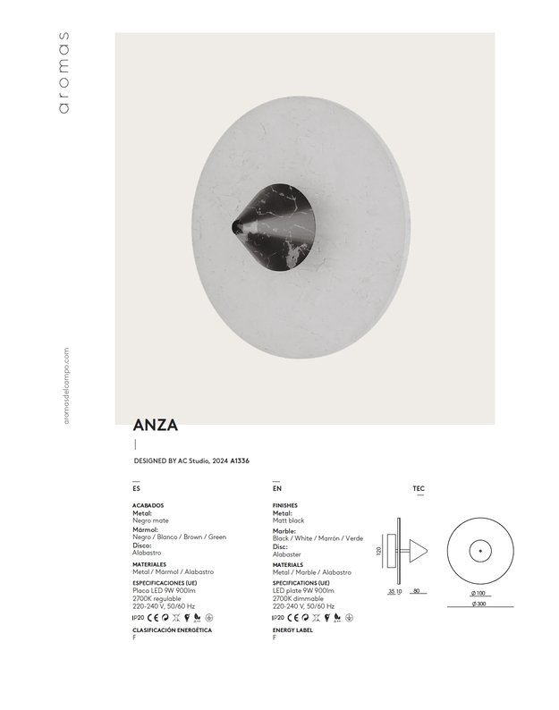 Anza šviestuvas iš Aromas del Campo kolekcijos. Aromas del Campo - 1986 metais įkurta bei tarptautinį pripažinimą pasiekusi Ispanijos šviestuvų kompanija. Aromas kolekciją sudaro architektūriškų formų šviestuvai, gaminami iš natūralių medžiagų, tokių kaip marmuras, medis, alebastras, stiklas.