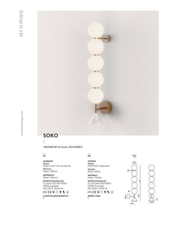 Soko šviestuvas iš Aromas del Campo kolekcijos. Aromas del Campo - 1986 metais įkurta bei tarptautinį pripažinimą pasiekusi Ispanijos šviestuvų kompanija. Aromas kolekciją sudaro architektūriškų formų šviestuvai, gaminami iš natūralių medžiagų, tokių kaip marmuras, medis, alebastras, stiklas.
