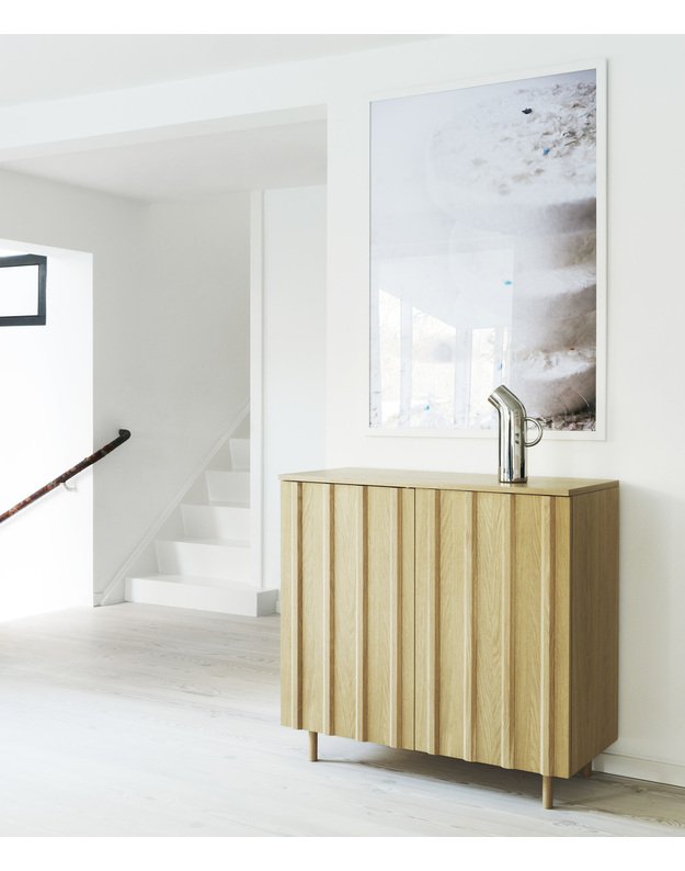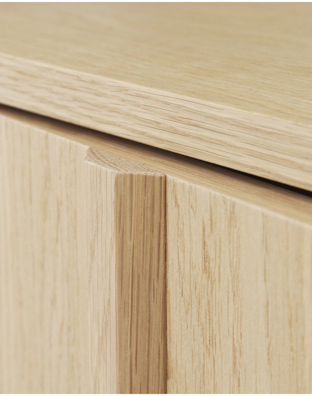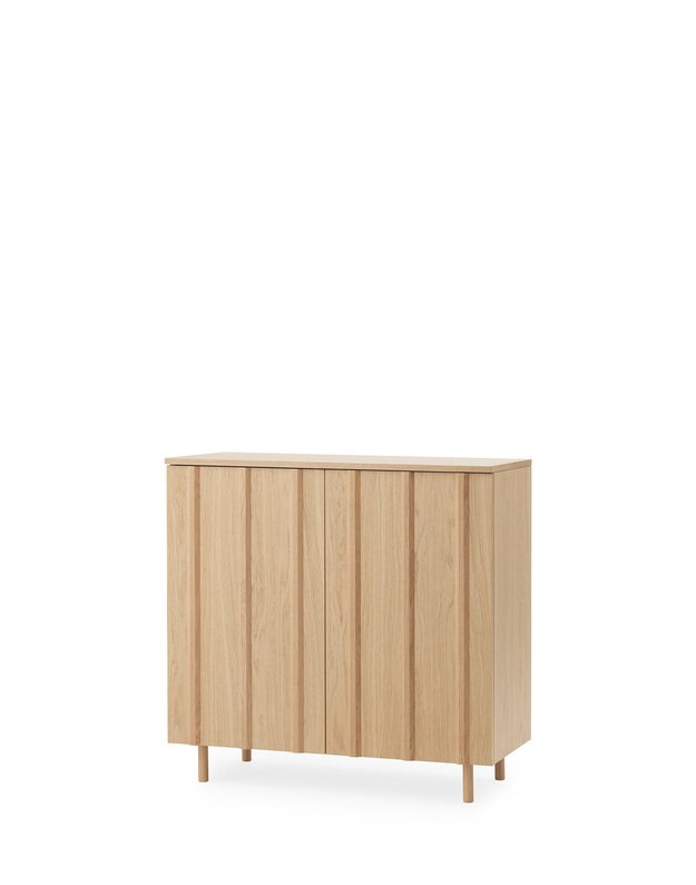 Rib is designed in lacquered oak veneer or painted and lacquered oak veneer with solid oak slats and base. Rib is equipped with a push latch, making handles redundant, and has removable shelves that can be adjusted in height, giving the possibility to store any object or belongings. Rib is delivered assembled.